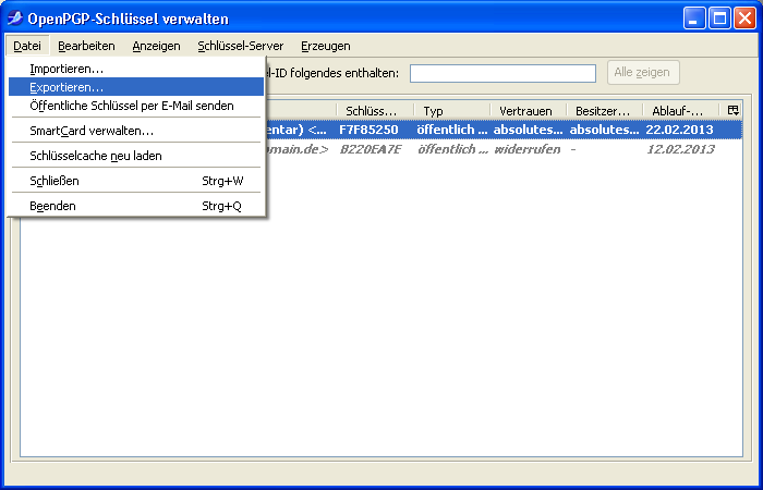 Exportieren eines SchlüsselsMan kann sowohl öffentliche als auch private Schlüssel in eine Datei exportieren. Um einen Schlüssel zu exportieren öffnen Sie das Enigmail-Verwaltungstool und markieren Sie den entsprechenden Schlüssel mit dem Mauszeiger. Klicken Sie anschließend in der Menüleiste des Enigmail-Verwaltungstools auf Datei und danach auf Exportieren (siehe Abbildung 10.5).