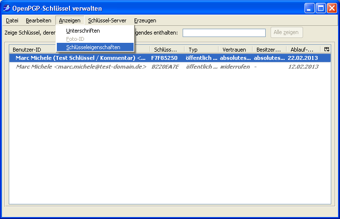 Schlüsseleigenschaften ansehenManchmal ist es wichtig bestimmte Eingeschaften eines Schüssel zu kennen, zum Beispiel um den Fingeabdruck eines Schüssels zu überprüfen. In den Schlüsseleigenschaften können Sie neben dem Fingeabdruck auch die Schlüssel-ID und den verwendeten Verschlüsselungsalgorithmus sehen.Die Eigenschaften eines Schlüssels bekommen Sie angezeigt, in dem Sie den Schlüssel markieren, dann auf Anzeigen und anschließend auf Schlüsseleigenschaften klicken (siehe Abbildung 10.31).